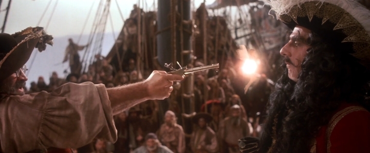 Men vad hade å andra sidan varit alternativet? En mörkare film med blodiga bataljer som i Master and Commander? Med bara BARN på ena sidan? Knepigt. Kanske allra bästa därmed vore att helt undvika öppen väpnad konflikt mellan BARNEN och piraterna... Istället för att pojkarna använder typ kanoner i stil med slangbellor och liknande laddade med icke-dödlig geggamoja utan blodspillan. Det hade räckt med duell mellan Hook och Pan, samt mellan Hook och Rufio medan Pan är upptagen med underhuggare då han räddar sin dotter eller något, men håll resten av de förtappade pojkarna i bakgrunden, ha inte dem i strid med piraterna för just det funkar bara inte.