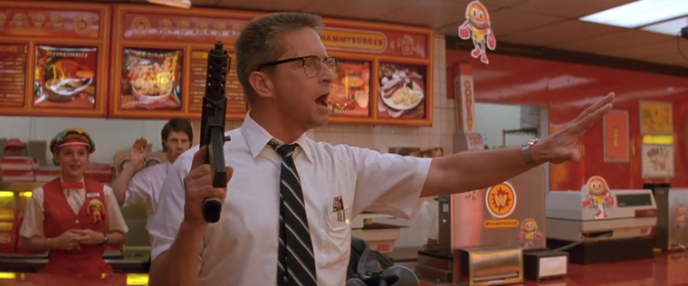Detta är en så bra film. I regi av Joel Schumacher, senare på 90-talet mest ökänd för löjliga Batman Forever samt framför allt den uppföljande kalkonrullen Batman & Robin, men mannen var faktiskt en väldigt duktig regissör som låg bakom riktigt bra filmer både före och efter, som The Lost Boys på 80-talet och Phone Booth på 00-talet. Hans allra bästa, mest minnesvärda och kulturellt fortfarande mest relevanta film är däremot just Falling Down här, ett kriminaldrama, antar jag att man kan kalla den, med Michael Douglas i huvudrollen som en man som en dag helt enkelt tappar besinningen och går bärsärkagång genom stekheta Los Angeles. På vägen råkar han uppgradera sin arsenal. Han börjar med inget och går sedan från baseballträ via automatvapen till fucking raketgevär! En tragikomisk historia. Även med Robert Duvall som en gammal polis som bara råkar plocka upp spåret efter Douglas karaktär.