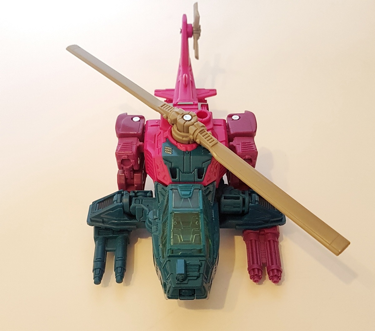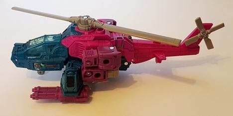 Robotformen döljs hyfsat. Största missen är att nävarna förblir fullt synliga där bak. Sedan är jag heller inget fan av att cockpiten som syns på benen av roboten inte finner sig helt på plats i fordonsformen. Bara ena benet blir faktiskt till cockpit i helikoptern medan andra benet är typ en dubblett som hamnar på undersidan av fordonet. Nej. Detta gillas icke... Cockpiten borde antigen vara delad på två så att benen gick ihop till att bilda den på helikoptern, som det var på originalfiguren, eller så borde det andra benet på roboten helt enkelt inte se cockpittigt ut alls. För som det är nu känns det lite fejk, som att de liksom fuskat med designen.