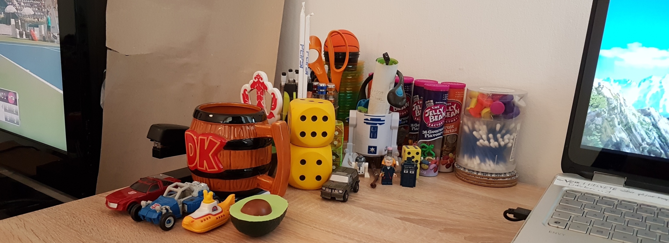 Och bredvid Beachcomber står... En liten Hot Wheels The Beatles Yellow Submarine. Kostade bara runt en tjuga ny i förpackning och det var den ju ändå värd. Sedan har vi min stressboll i form av en halv avokado med kärnan i och en bit längre bort en av mina mest sentimentalt värdefulla leksaker. Ni förstår, min allra första figur som transformerade från robot till bil var ingen Transformer men just den här. Bandai GoBots Scratch från 1984. Faktum är att Scratch är nog den äldsta leksaken som jag har kvar ända sedan barnsben på 80-talet. Han är min egen Woody typ. Så hur sliten han än blivit de senaste över 30 åren behåller han ändå sin plats på display hos mig. Bakom Scratch står några stycken Lego-minifigurer som jag tycker så bra om att jag gärna har dem framme. Den tolfte Doktorn med en liten TARDIS ingick i en Lego Doctor Who Level Pack från 2015 som jag faktiskt fick i gåva från en medhjälpare här på redaktionen. Typen i gul kostym med ett suddgummi som huvud kallas Eraser och är en fånig gammal Batman-skurk. Han var en del av serien med minifigurer ur Lego Batman-filmen från 2017 och honom fick jag helt random i en sådan där påse där man inte ser vad för figur man får när man köper den på vanligt vis i butik. Sist men inte minst har jag också en lego R2-D2 men exakt varifrån jag fått den, det minns jag ej helt. Jag har för mig att den medföljde någon bok eller tidning eller nåt sånt. Bakom lilla Lego R2-D2 står en större ihålig R2-D2 som jag plockat bort "locket" på och använder som en slags pennkopp. Fast med lite andra saker däri. Och mellan benen på den stora R2-D2 ligger Mjölner i miniatyr... Thors hammare alltså. Marvel-Thor mao. Den ser jag alltid till att ha nära till hands. Varför..? Jo, för jag brukar använda den när jag slår in presenter. Den är perfekt till att hålla pappret på plats medan man tar en tejpbit.