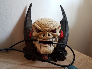 Och så tar vi ett steg bakåt så att man ser hela skrivbordet. Och vad har vi då där till höger? Är det inte..? Jo, visst är det. Min gamla megaskalle. Storskurken själv i egen hög person. Typ. En tredje vågens Mighty Max Mega Heads Skull Master. Egentligen finalen på Mighty Max-arkivet så se det här som en teaser. Såklart öppnar jag inte upp den här och nu. Och inte heller tänker jag gå händelserna helt i förväg och börja beskriva allt med den. Det får vänta tills efter jag gått igenom den tredje vågens Horror Heads, Shrunken Heads samt Heroes & Villains på Mighty Max-sidan av sidan. Men ja, såhär ser den ut i stängd form i alla fall. Som ni kan se kan den öppna truten också. En egenskap som jag tagit tillvara på och nu använder jag den till att hålla strömsladden till datorn mellan tänderna. Främst för att sladden ej ska glida ner på golvet bakom skrivbordet när den inte är inpluggad. Fräckt ser det också ut tycker jag.