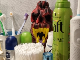 Och så till sist då för den här gången för den här delen av sidan. En återkoppling till en idé jag hade januari förra året. "Var är de nu?" liksom. Toysen från den där bunten jag köpte under första året med den här bloggen. Jag nämnde ju ifjol att detta kanske kunde bli en liten lek, typ att se vilken toy från den loten som skulle bli kvar framme sist ā la da last toy standing. Aningen naivt kanske trodde jag då att detta bergis kunde pågå i flera år framåt... Men icke. Leken är över och vinnaren är Death Mountain... Vad skriver jag, Skull Mountain-schampoflaskan! Det är den enda som fortfarande syns till alltså. De gamla nya He-Man-mutanterna plockades undan då jag behövde göra plats i hyllan för böcker och sånt och därmed måste plocka undan konsolerna som stod där, inklusive Saturnen de satt på då. Vart min nya Cindersaur tog vägen minns jag inte ens men han sitter då i alla fall inte ovanpå skrivaren som han gjorde för ett år sedan. Och den lilla Bad Eggz-figuren som jag hade i lådan i lådan är väl säkert där fortfarande, men begraven under en massa andra prylar... Så att ja, Skull Mountain-schampoflaskan vinner leken!