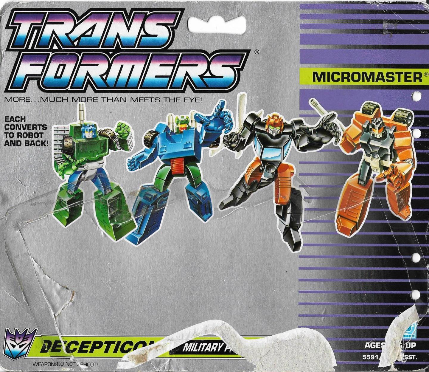 Micromaster-patruller hade jag många av. Jag gillade verkligen den här idén. Tyckte att de små figurerna var ofta mer rörliga i sina robotformer än de "fullstora" Transformers-figurerna som köptes enskilt. Ju större enskild figur desto dyrare var den dessutom så jag kunde inte räkna med att få lika många större figurer som Micromasters och för mig var det mycket viktigare att ha ett större antal olika figurer i samma storlek än att ha färre figurer i helt olika större storlekar. Jag var sålunda helt såld på Micromasters. En patrull och en Combiner Squad per sida och man kunde redan iscensätta små fältslag liksom! Och jo, de där hålen i kartongkorten... Det är nog från när jag i min tidiga barndom ville dokumentera cardbacksen och samlade dem i pärmar.