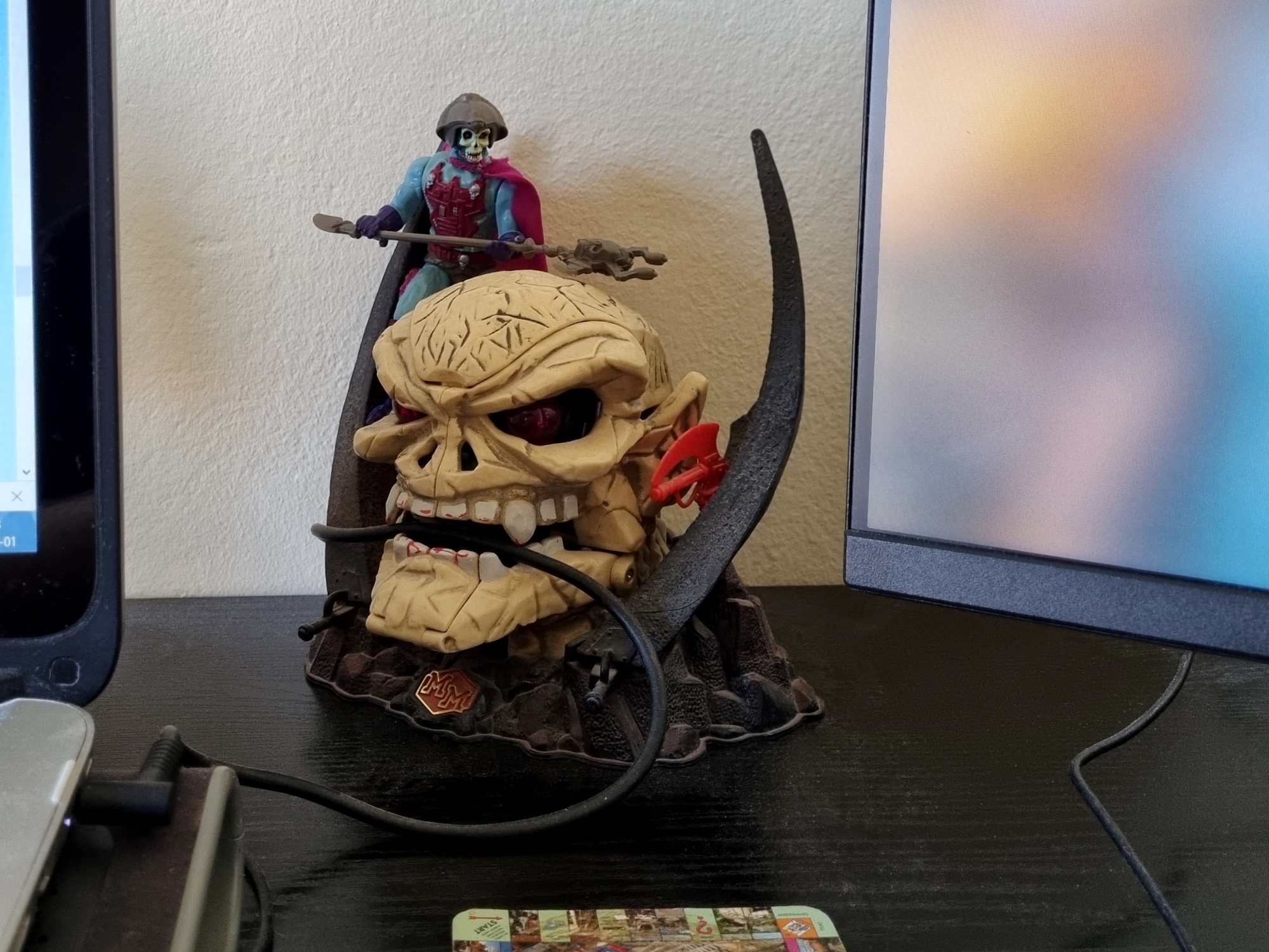 Där, på megaskallevarianten av Skullmaster, fick min nya gamla nya Skeletor vara nu. Jag kunde ju inte ha honom ståendes framför en av skärmarna och längre ut på kanten till höger, där han stod på det första av fotonen ovanför det förra stycket i det här inlägget, funkade inte heller för just där gillar jag att ha fötterna uppe på skrivbordet. Så jag satte honom på Skullmaster. Tittar man bara på den första bilden ovanför detta stycke tänker man kanske att han lika gärna hade fått plats att stå bredvid men nej. För nu sitter jag ju inte direkt i mitten av de båda skärmarna heller utan jag sitter rakt framför min laptop, dvs den till vänster. Så som ni ser Skeletor på bilden ovan till höger är följaktligen hur jag ser honom utifrån mitt eget synfält när jag sitter här framför datorerna. Så det funkar för mig. Och ja, jag vet att det börjar bli dammigt på bordsytan där bakom. Det blir en lätt axelryckning åt det.