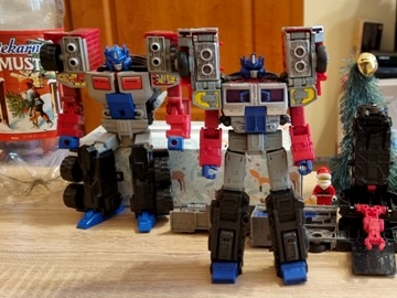 Något iögonfallande är även ögonen på figurerna. Där den äldre Prime körde med gimmicken för Generation 2 med de mer eller mindre transparenta hjässorna, eller hjärnorna som vi kallade det, på baksidan av huvudet som gör att det ser ut som att ögonen liksom lyser så gör den nya Prime inte det och det ser följaktligen ut som två gapande tomma svarta hål där dess ögon ska vara. Vidare tycker jag att de feta hjulen på den äldre figuren passar bättre till vad som trots allt ska föreställa en lastbil än den nya figurens sparkcykelhjul. Nu har jag varit ganska kritisk mot nyversionen men med allt det sagt tycker jag ändå om den nya figuren också och en del saker som man gjorde om gjorde man rätt. Att det inte längre står OPTIMUS PRIME med stora bokstäver på sidan av släpet t ex. Och att man likaså skippade klistermärkena för de båda vindrutorna där det står OPTIMUS och PRIME... För ja, detta var faktiskt väldigt löjligt måste medges. Den nya Prime kommer dessutom med en liten Matrix som man kan plocka loss ur bröstkorgen. Figuren är dessutom lite bättre målad på vissa ställen. Så det är inte bara en massa minus, den har också flera plus gentemot den gamla. Så nog blev jag glad för den alltid. Och så fick jag ju göra detta inlägg tack vare den. Men nu får jag tacka er som läser det här för visat intresse. Och gott nytt år!
