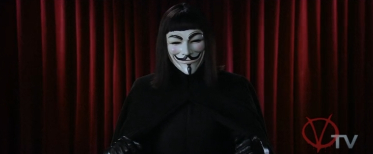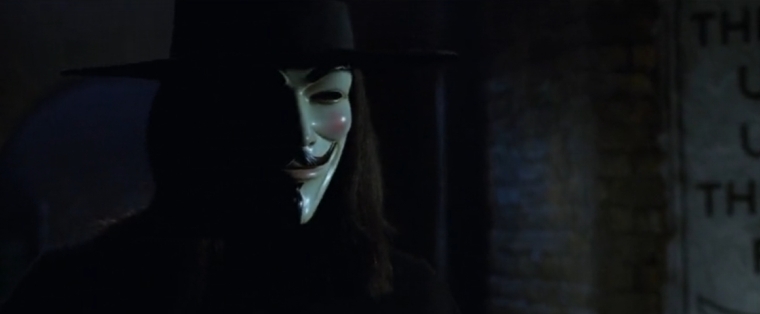 Vi får minsann en kort historielektion här om en viss Guy Fawkes som år 1605 ämnade att spränga det engelska överhuset, den ena av parlamentets två kammare, även om filmen förenklar det hela med att han försökte spränga hela parlamentet. Denna verkliga historiska kontext, den sk krutkonspirationen 1605, är vad som inspirerar vår hjälte att i princip göra detsamma, samt fler sprängdåd plus mord, iklädd en Guy Fawkes-mask.