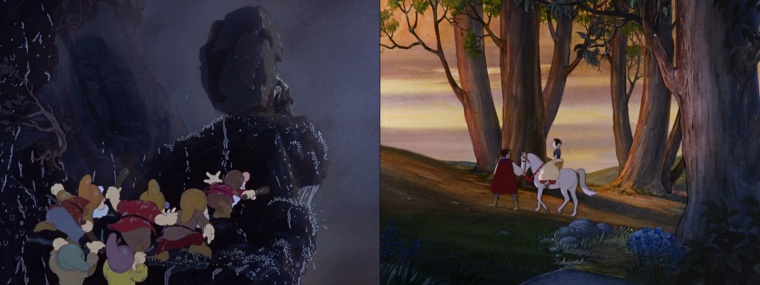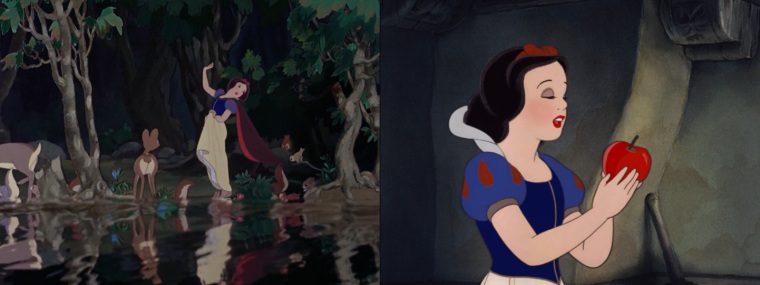 Skogsdjuren hjälper dock sedan Snövit för att det är en Disney-film men betänk att detta var ju inte en grej på den tiden när filmen först gjordes. Snövit var faktiskt banbrytande för sin tid. Det här var ju också världens första tecknade långfilm både i färg och med tal. Och det hela är mycket bra animerat, mycket imponerande, så vackra och naturliga reflektioner i vattenytor, som om det vore med hjälp av CGI för att skapa effekterna, samt karaktärernas rörelser, så smidiga, kroppsspråket, så livfullt, som om det vore genom motion capture men nej, allt det här var helt handritat vilket också är helt otroligt. Detta är ju en nästan förlorad konstform numera. Man ser vissa intressanta perspektiv också, fiffiga "kameravinklar" typ, allting är inte bara rakt på liksom.