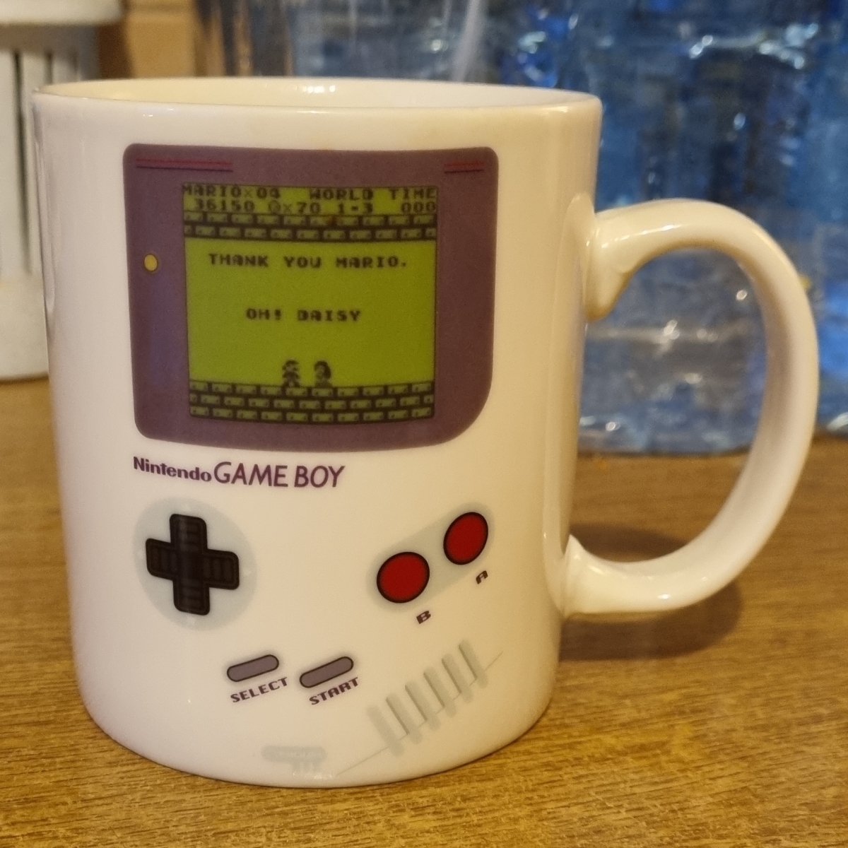 En Nintendo Game Boy-kopp alltså. Och jag är väl egentligen inte ett särskilt stort fan av denna konsol... Jo, jag hade en redan som kid på 90-talet och jo, jag har ganska många spel till den men de allra flesta köpte jag på mig först i efterhand, i vuxen ålder långt in på 2000-talet och ännu senare in på 2010-talet. Och min egen original-Game Boy var svart dessutom. När jag först fick den här så tackade jag såklart så mycket men tänkte att den för det mesta nog bara skulle stå i köksskåpet. Icke så. Icke alls. Till min förvåning blev jag väldigt förtjust i den väldigt snabbt och just nu är den en av mina mest använda koppar. Först och främst passar Game Boy som mönster på koppen då den konsolen "stod" liksom upprätt. Vidare så gillar jag vita koppar och jag tycker även det passar bäst för denna. Därtill är det en sådan där "en bild syns då det är varmt kaffe i koppen"-historia. Som när det görs rätt är väldigt fräckt. Och här görs det rätt. Vad man ser är alltså en spelskärm rakt ur Super Mario Land. Klockrent. Men det slutar inte där. För den här koppen har motiv på båda sidor om örat, något jag uppskattar, och därtill så är det olika motiv på varje sida som syns där i spelskärmen, något jag verkligen gillar. När det sedan inte är något kaffe kvar i koppen, eller om man låtit det svalna tillräckligt, blir spelskärmen helsvart, vilket ser väldigt stilrent ut. Jag är golvad. Detta är en kanonkopp kort och gott!