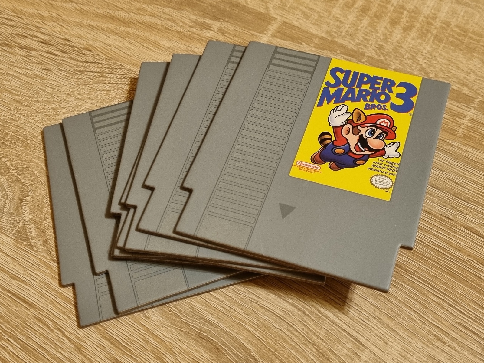 Och så denna då... En serie kaffekoppunderlägg som efterliknar gamla hederliga NES-kassettspel! Underbart. Dessa är inte lika tjocka som Doctor Who-underläggen, som dock är ovanligt tjocka, utan mer platta så som de flesta vanliga underlägg. Det lite ovanliga med dem är själva formen, då de ju är formade efter just NES-kassettspel och därmed inte bara helt kvadratiska, och det unika med dem är såklart omslagsbilderna från dessa gamla Nintendo-spel i fråga. Här finns åtta stycken underlägg, var och ett med sitt eget motiv; Donkey Kong, Super Mario Bros, SMB2, SMB3, Excitebike, Duck Hunt, Metroid samt The Legend of Zelda. Och när jag köpte de här så tänkte jag ha dem för mig själv från början men gav dem sedan till sonen som verkligen intresserar sig för detta med retrolir. Ja, ett sådant intresse vill man som gammal spelpappa allt uppmuntra och så tänkte jag att han får mer glädje av dem än jag som bara hade haft dem som just koppunderlägg.