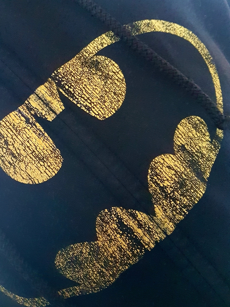 Några fler plagg med just det Batman-märket som gjordes så ikoniskt i och med filmen från 1989 och variationer på detta passade jag även på att rota fram ur garderoben. Från vänster här ovan ser ni min trogna luvtröja och två av mina T-shirts. Den ena väldigt stilren och den andra i en lite slarvigare stil som dock passar perfekt att ha undertill just den luvtröjan då just de två plaggen reflekterar varandra tycker jag. Det som ska se sådär slitet ut, det gula på den svarta luvröjan respektive det svarta på den gula T-shirten, återspeglas rätt fräckt.