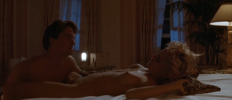 Mest minnesvärd för Sharon Stones roll, och också utan tvekan DEN filmen som hon blev som mest berömd för och har därför tidigare även tagits upp som en av hennes topp-5 mest väsentliga filmer. Fast det är ju Michael Douglas som trots allt har huvudrollen som mordutredare, där Stones karaktär är den huvudmisstänkta. Scenen då hon korsar benen och blottar fittan är en klassiker. Lite kontroversiell kanske men Stone själv har senare medgett att det var rätt beslut att visa hela hennes härlighet på stora duken. Och det där var en helt annan scen än den från bilden här nedan där man klart och tydligt också ser hennes muff mittemot Douglas, den lyckosten! Det är så mycket naket i denna alltså. Mums.